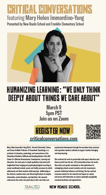 Critical Conversations Featuring Mary Helen Immordino-Yang Presented by New Roads School and Franklin Elementary School on March 9th at 5pm via Zoom.
