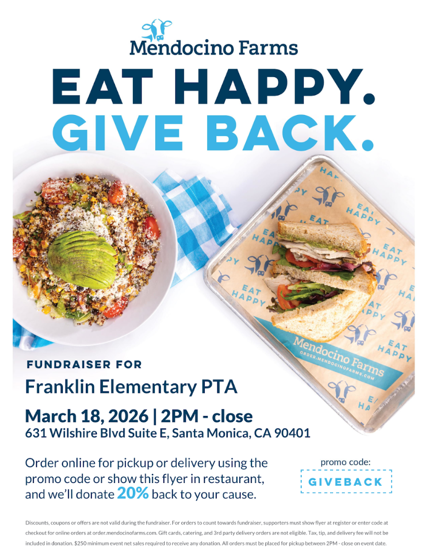 Who's hungry? Let's all eat at Mendocino Farms on Wednesday, March 18th, from 2pm-close. Mendocino Farms will donate 20% back to the Franklin PTA.