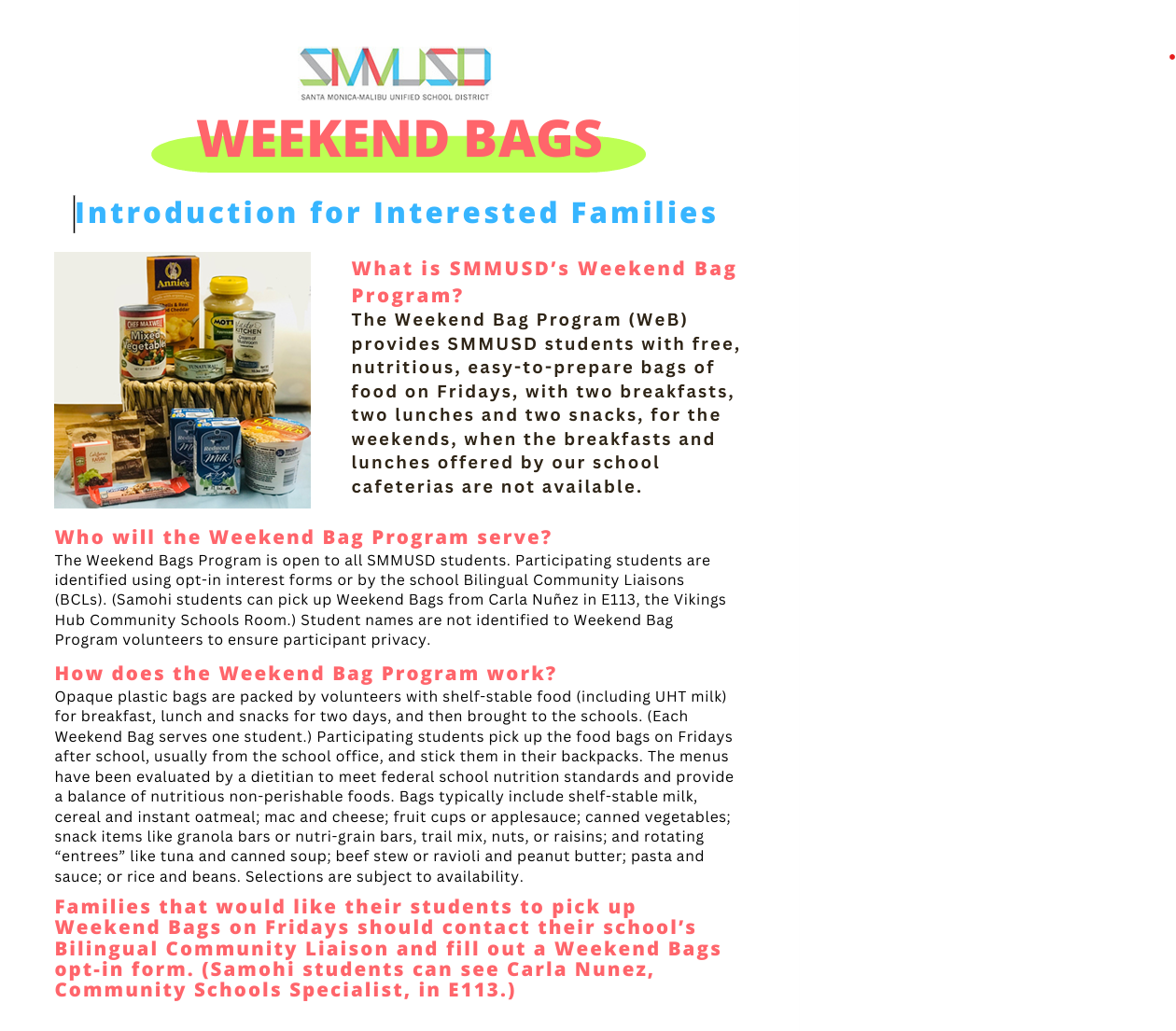 The Weekend Bag Program (WeB) can provide SMMUSD students with nutritious, easy-to- prepare bags of food containing 2 breakfasts, 2 lunches and 2 snacks for the weekends. The Weekend Bag Program is available to serve to all SMMUSD students. Student names are not identified to Weekend Bag Program volunteers to ensure participant privacy. Opaque plastic bags are packed by volunteers with enough shelf-stable food (including UHT milk) for breakfast, lunch and snacks for two days. After school on Fridays, participating students pick up the food bags, usually from the school office, and stick them in their backpacks after school on Fridays. The menus have been evaluated by a dietitian to meet federal school nutrition standards and provide a balance of healthy, nutritious non-perishable foods. Families wishing to enroll their students should contact our school’s Bilingual Community Liaison, Florencia Rams, frams@smmusd.org and fill out this form.